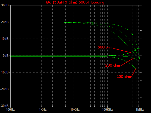 Everything changes with MC cartridges because self-inductance drops to very low levels, anywhere from 5uH to 500uH for a low output type and up to 5mH for high output type. Using a generic low output MC of 50uH and 5 ohms into 500pF loading (solid-state headamp or phonostage) we can see that bandwidth is superb up to the resonance frequency of 1MHz. Load resistance is varied from 100 ohms to 500 ohms. As you can see, there is almost no change in audio band other than a slight attenuation.