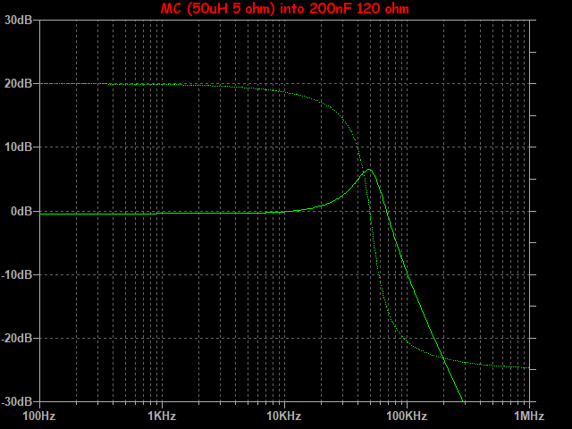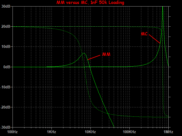 Now let's do a quick comparison between MM and MC, both using 1nF and 50k loading. Notice the electrical resonance of the MC cartridge (50uH and 5 ohms) is well above the audible spectrum! You won't hear this, although it may be a reasonable thing to tame.